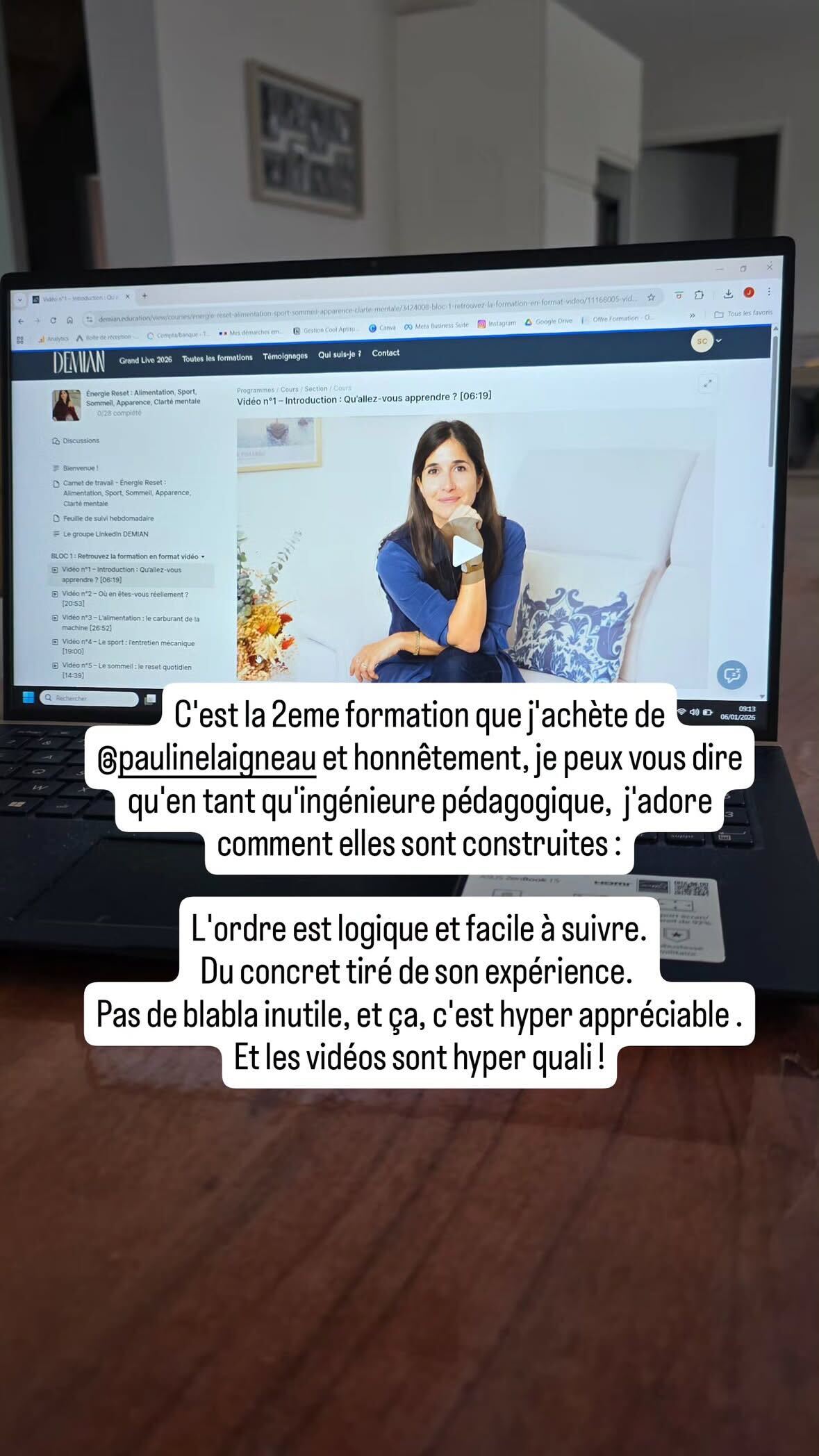 La formation est très intéressante et m’aide déjà à prendre conscience de mes habitudes, qu’elles soient bonnes… ou moins bonnes ! Ce que j’aime, c’est que lorsque l’on met le doigt sur ce qui peut être amélioré, cela montre justement qu’on a encore une belle marge de progression. Et c’est très motivant !"