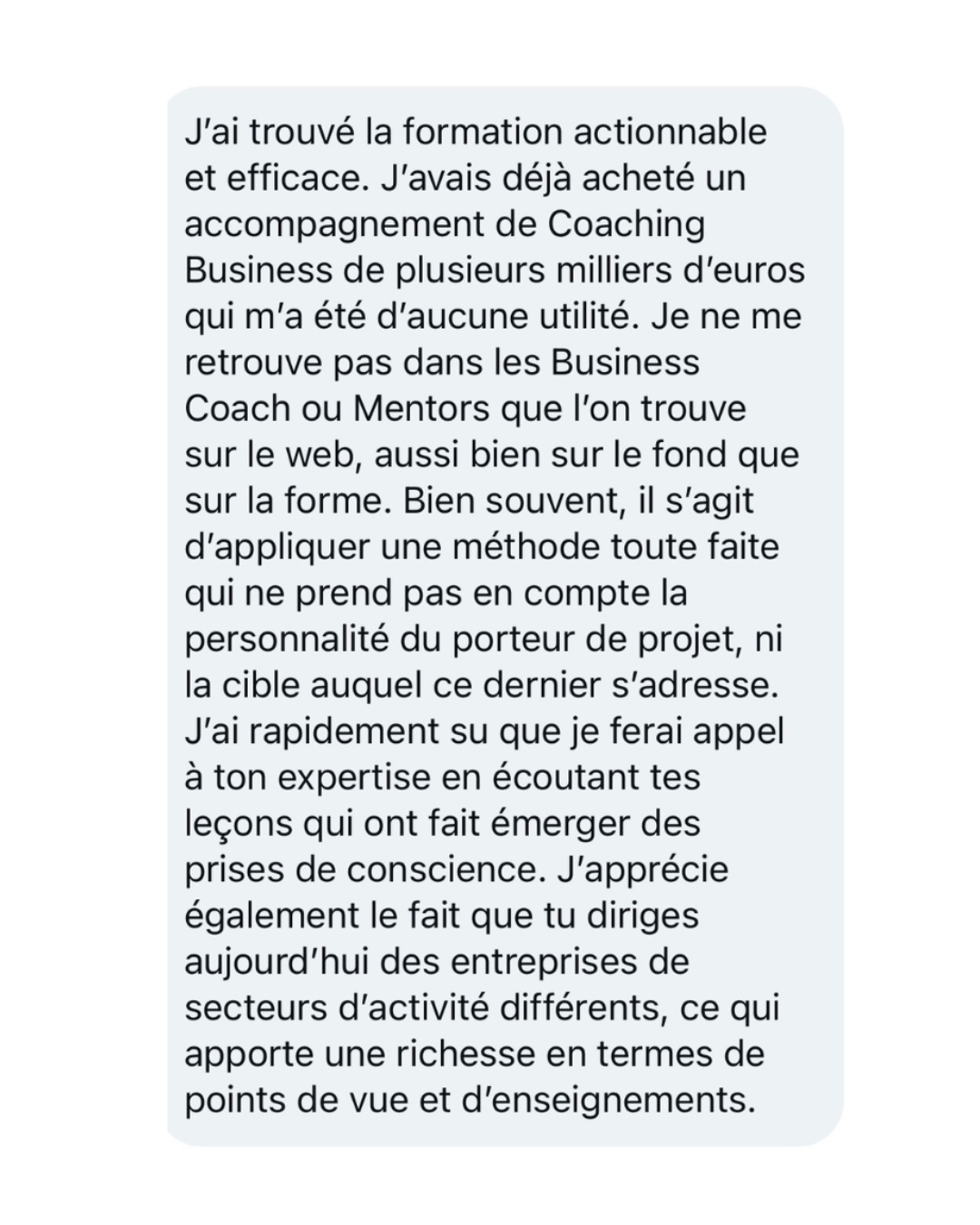 Oui car vous allez partir avec des bases solides dès le départ : un client clairement défini (je vous explique tout de A à Z), un positionnement précis et un système simple pour trouver vos premiers clients. Résultat : vous avancez plus vite, vous évitez les erreurs classiques et vous ne perdez pas des mois à tester au hasard. Vous allez gagner des années.