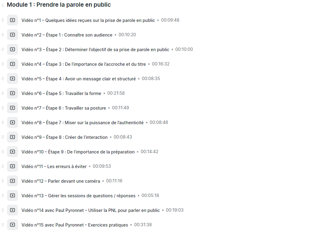 ✓ Au total, plus de 20 vidéos qui pourront être visionnées à l'infini et où je vous explique comment prendre la parole en public avec succès et s’exprimer face à ses pairs.