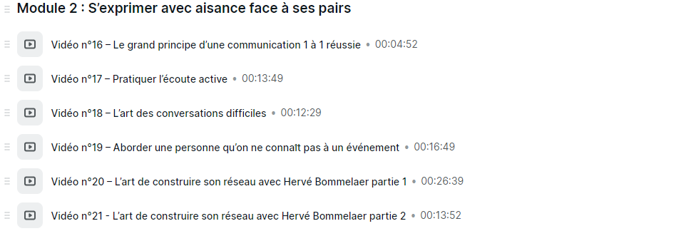 ✓ Près de 6h de formation-vidéo en accès illimité et à vie pour apprendre à s’exprimer avec aisance en toutes circonstances.