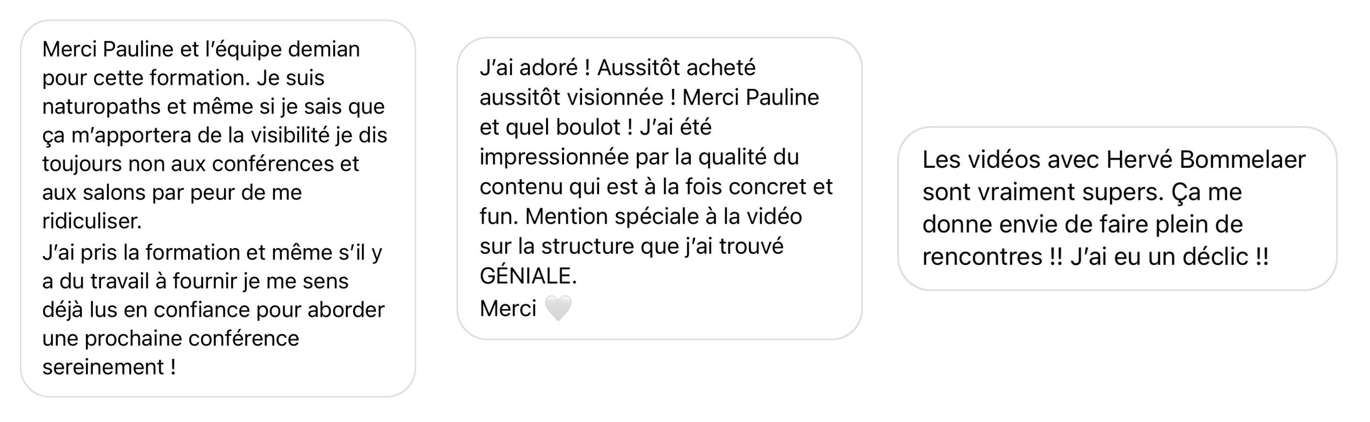 “J'ai particulièrement aimé le module sur la prise de parole entre pairs. J'y suis allée un peu à reculons car je fais partie des gens qui détestent devoir “réseauter”... et je dois dire que tu m'as complètement convaincue : non seulement les conseils sont faciles à appliquer (j’ai fait le test ce week-end à un évènement à Bordeaux) et en plus je me sentais plus à l’aise pour parler de mon projet et tisser du lien autour de ça ! Alors merci ! - Nathalie