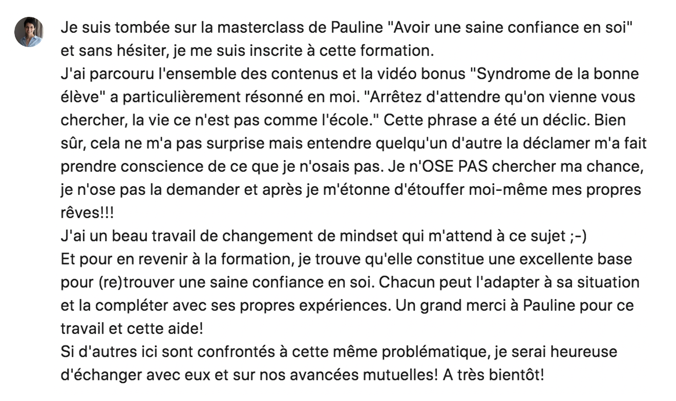 Une fois installée, vous verrez à quel point cette confiance est un cercle vertueux pour oser accomplir les projets qui vous tiennent à coeur, que ce soit :