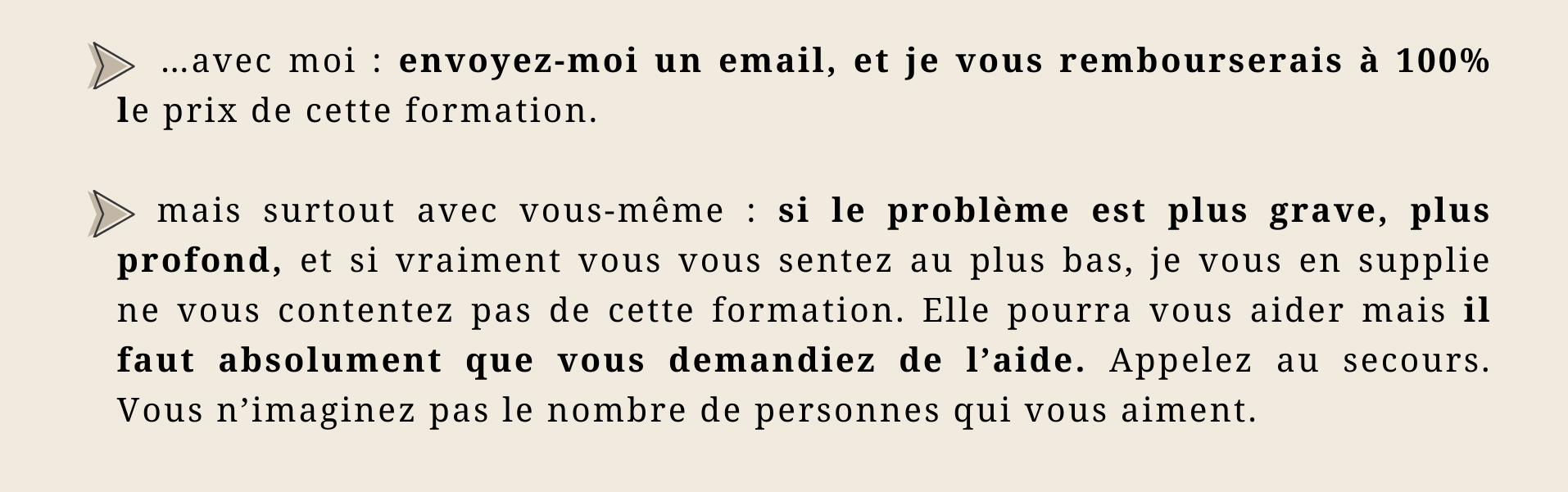 Et si vous jugez que les 2h45 de formation-vidéo, votre carnet d’exercices et tous mes conseils ne vous aident pas à (re)trouver un début de confiance en vous dans les 30 jours...