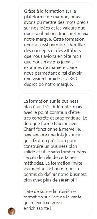 Nous avons suivi 2 formations Demian proposées par Pauline Laigneau, une sur la plateforme de marque et l'autre sur le business plan. Celles-ci nous ont été extrêmement utiles pour nous accompagner dans la création de notre marque de prêt-à-porter.